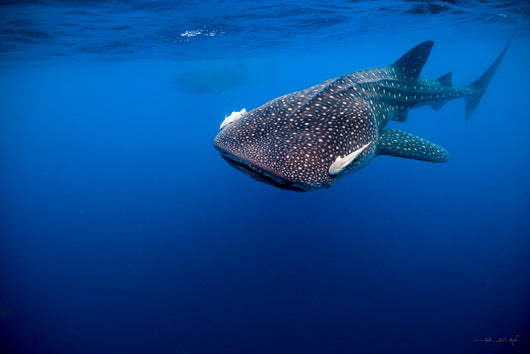 Nature demonstrates the symbiotic relationships that connect us all. A couple remoras flank the face of this approaching whale shark in Isla Mujeres. The remora rides along the whale shark in exchange for keeping the whale shark clean.